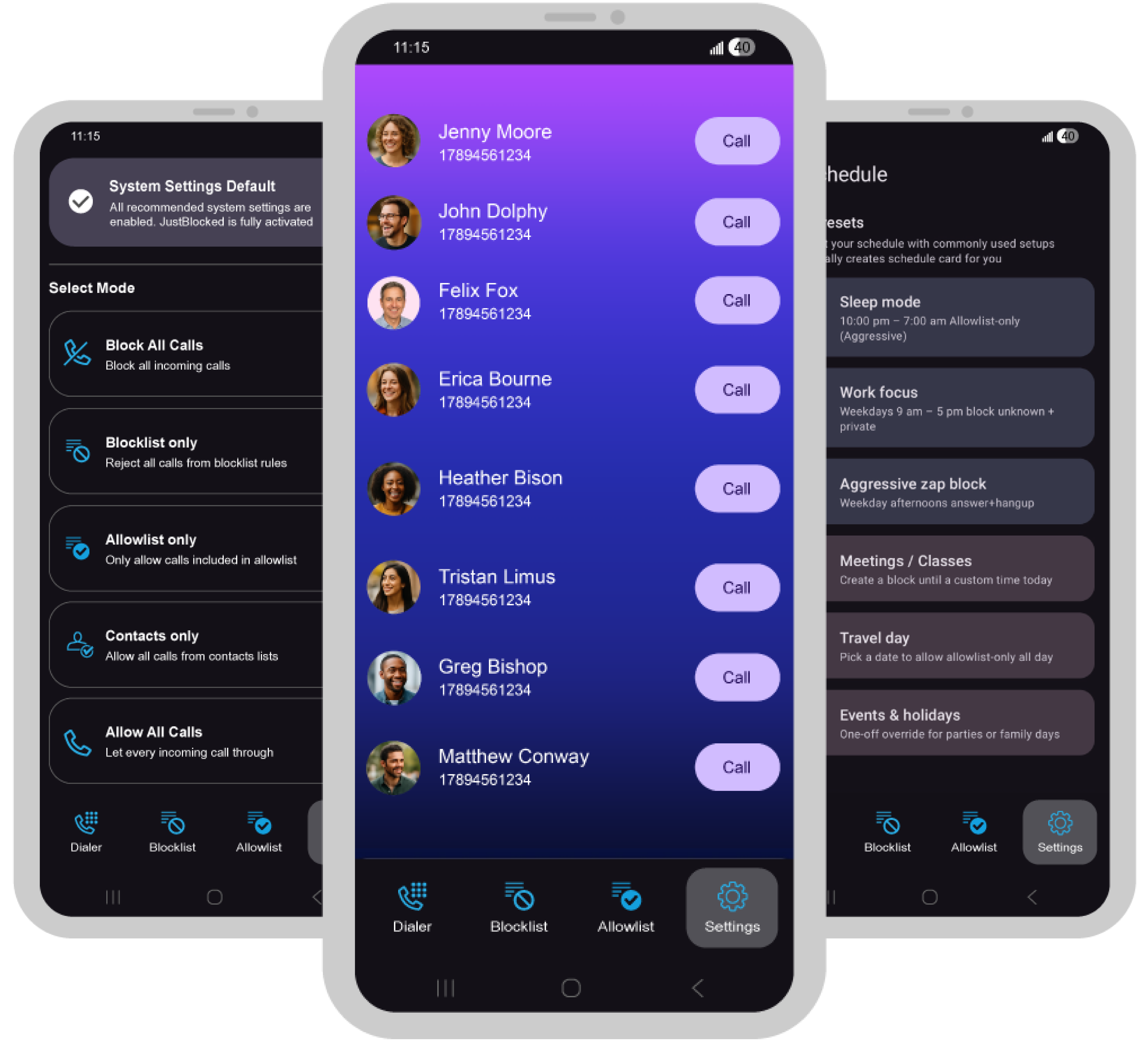 Tailor who can reach you. Maintain precise blocklists for known spammers, allowlists for VIP contacts, and switch between modes—block-all, contacts-only, allow-all, and more—with a single tap